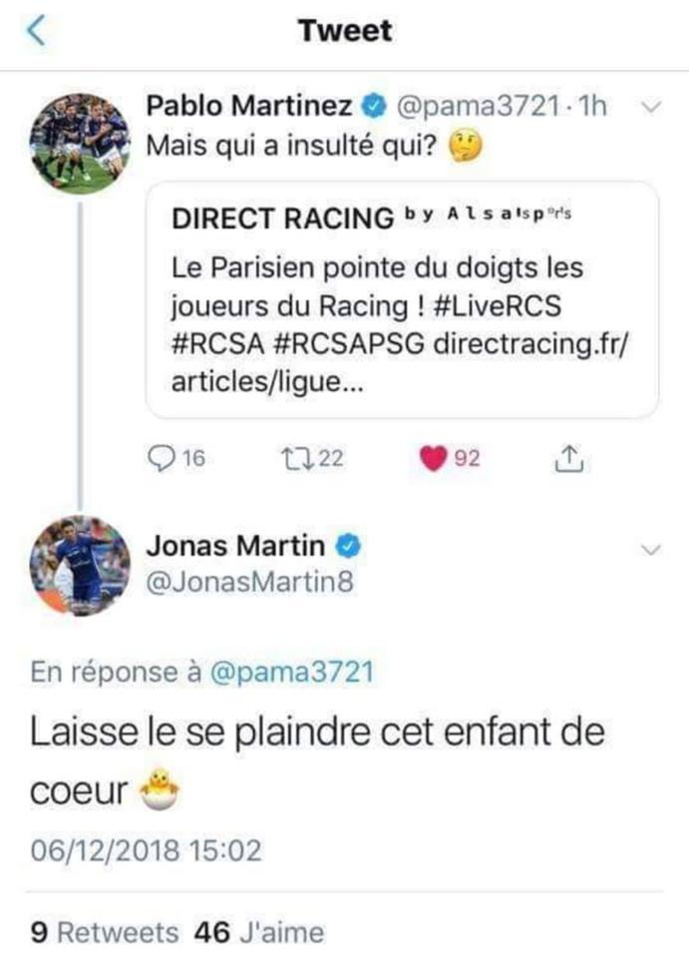 Alors qu'il s'est plaint d'avoir été insulté lors du nul concédé par le PSG face à Strasbourg, Marco Verratti a été repris de volée par des joueurs du RCSA. En effet le capitaine du club Alsacien, Jonas Martin, a sur Twitter demandé au milieu de terrain italien d'arrêter de faire sa pleureuse.
